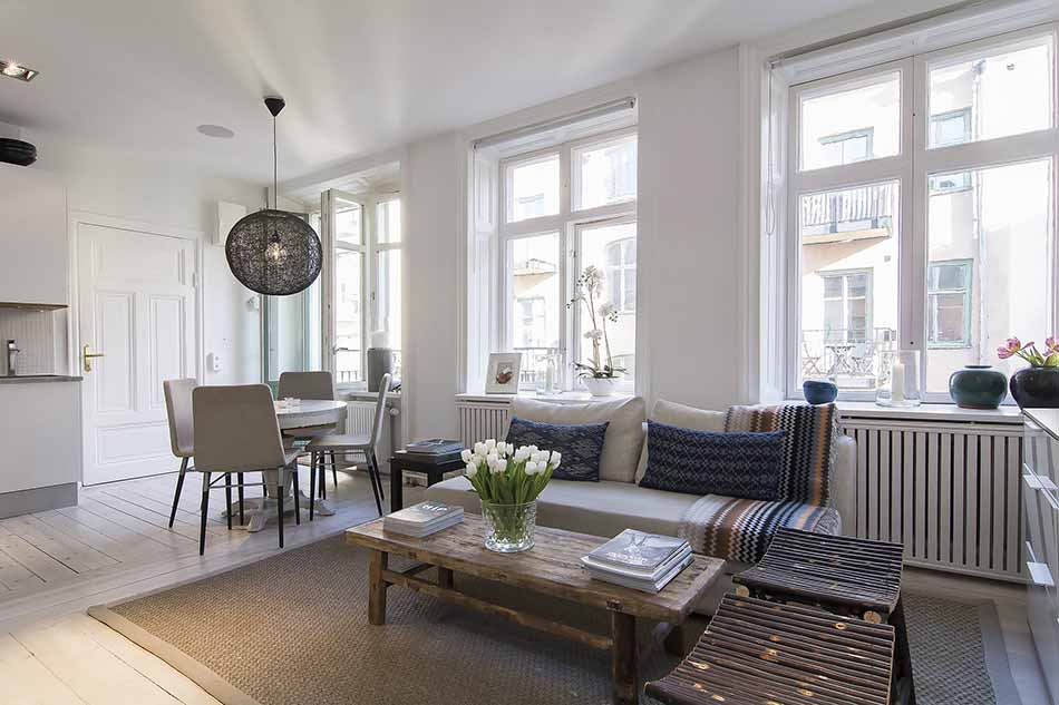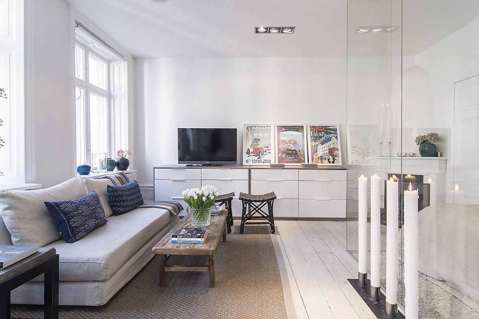 The first interior you are likely to observe upon entering this apartment is the bedroom, creatively separated from the
